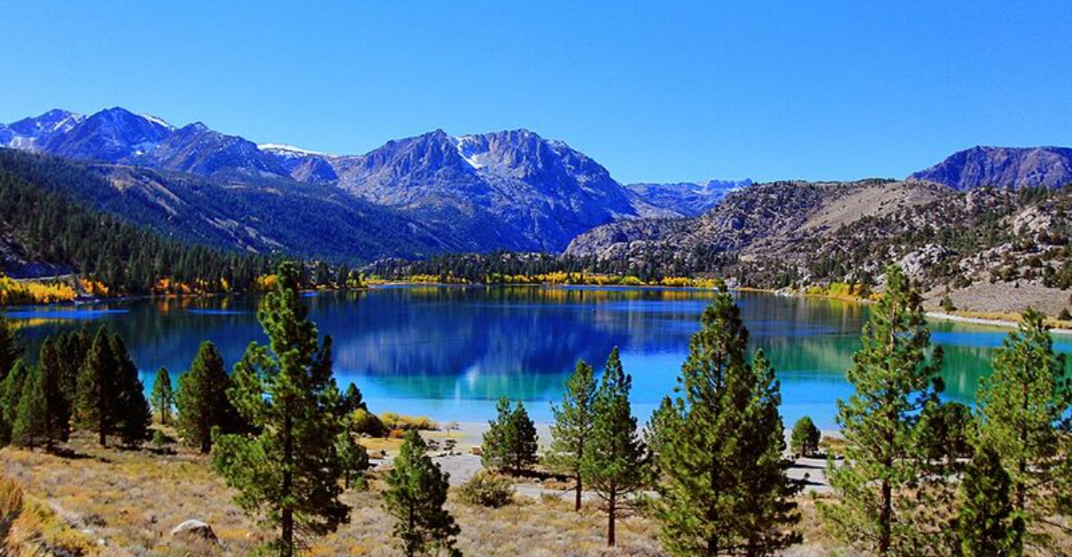 The loop passes all four lakes, June, Gull, Silver, and Grant, each one uniquely gorgeous in its own right. In fall, the aspen trees along the road turn this insane shade of gold and orange that honestly made me question whether I was still in California or had somehow teleported to New England.