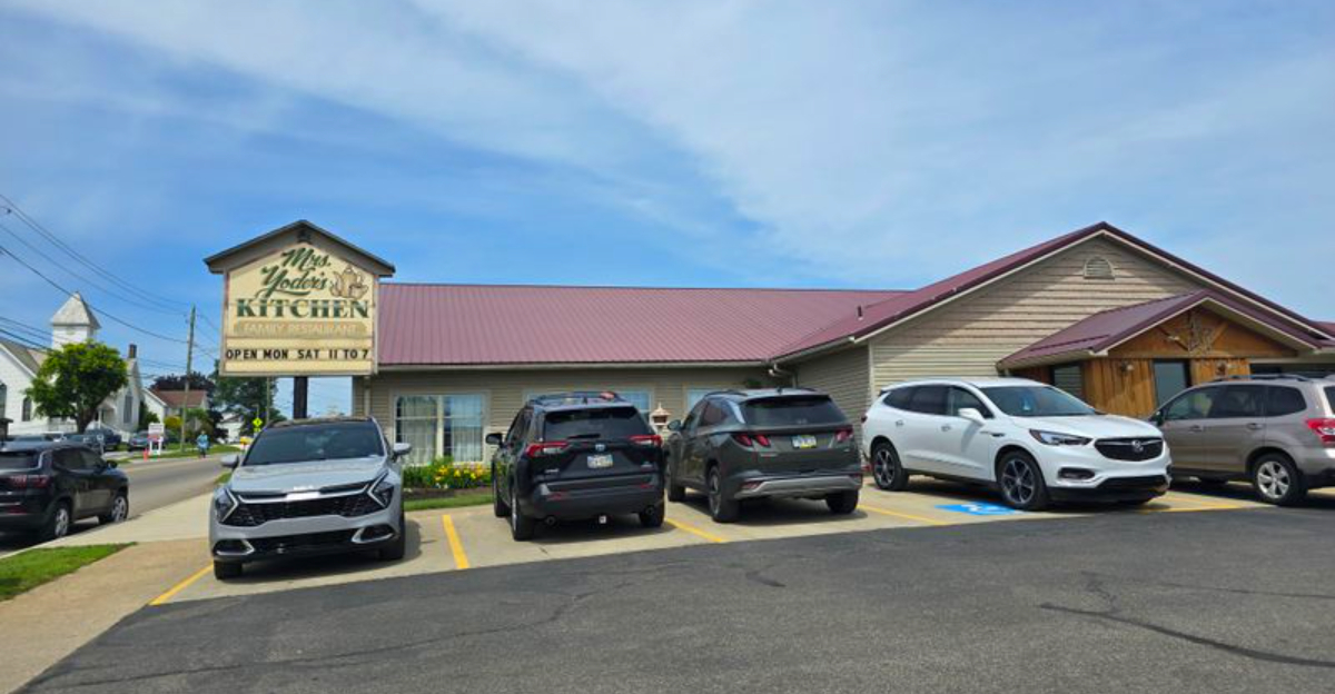 At Mrs. Yoder’s Kitchen, the parking lot looks like half the county decided to meet for supper at the same time.