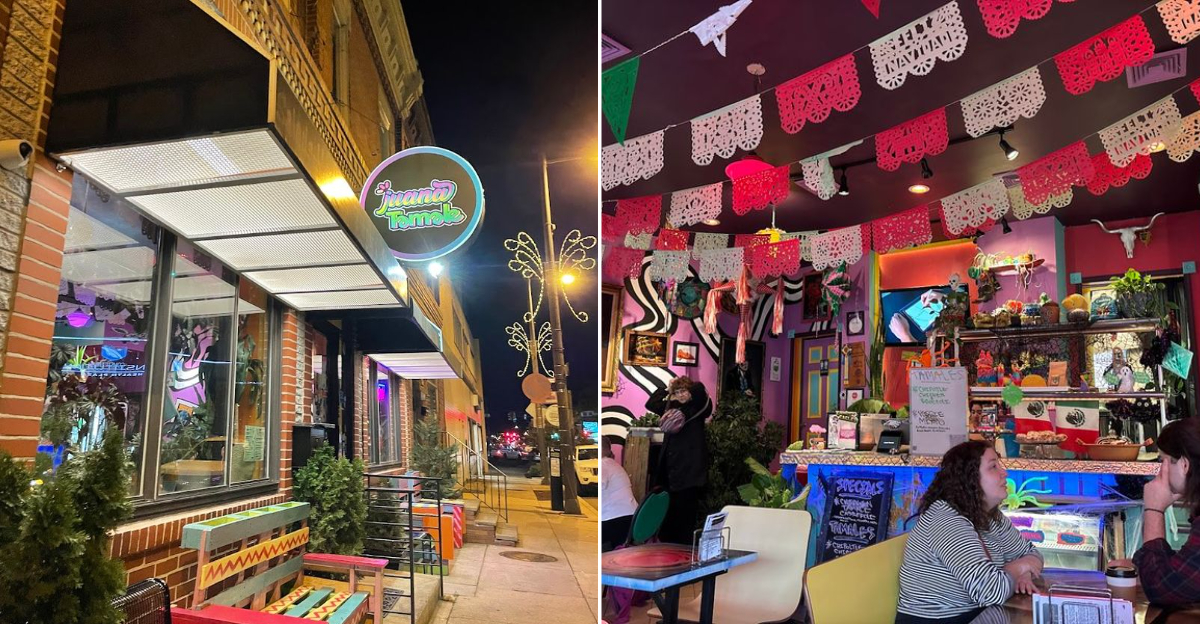 Walking into Juana Tamale feels like stepping into a visual party. The walls are covered in stickers, velvet paintings, and art pieces that give the space a funky, layered personality.