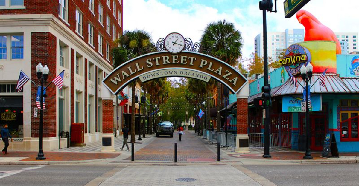 There is something immediately different about walking onto Wall Street Plaza compared to any other entertainment destination in Orlando. The brick road beneath your feet, closed entirely to vehicle traffic, signals right away that this space belongs to people rather than cars.