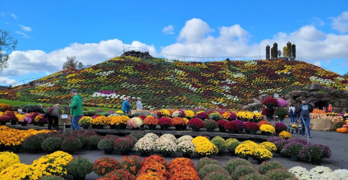 Picture a hillside so covered in chrysanthemums that the entire slope looks like a living painting. That is exactly what greets visitors at Ott’s Exotic Plants every autumn season in Schwenksville, Pennsylvania.