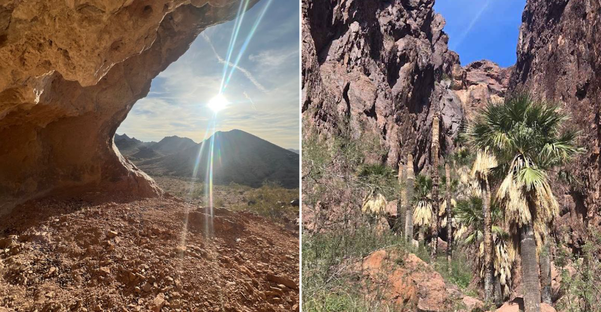 I remember rounding a bend in this remote Arizona canyon and feeling like the landscape had suddenly changed the rules. One minute it was all stone, dust, and silence, and the next there was a cluster of native palm trees rising beside clear water like something the desert had no business hiding.