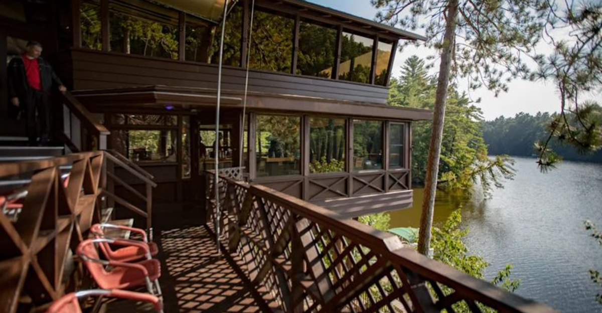 Most restaurants sit beside water. This one practically floats on it. The building sits inside Mirror Lake State Park, just minutes from Wisconsin Dells, with towering pines pressing in from every side.